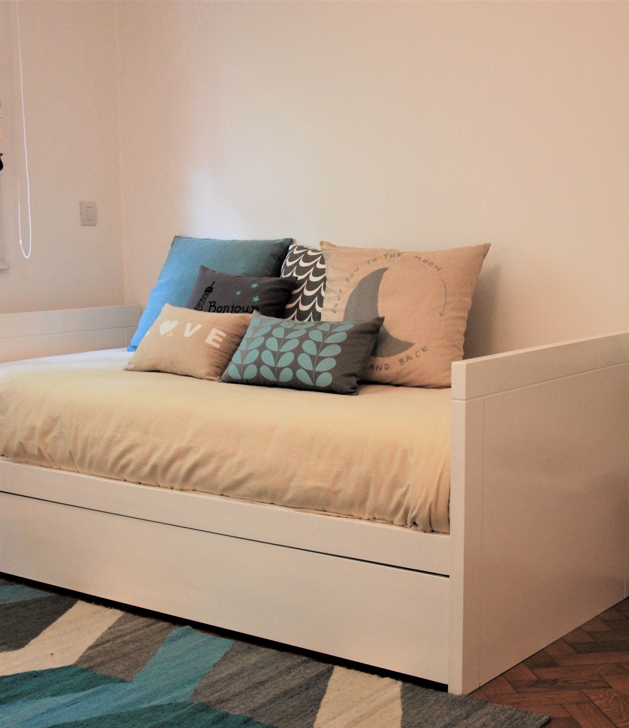 Tips: Un par de almohadones contra la pared ayudan a darle el look de diván. Sumale una linda lámpara de pie o una estantería como la de la foto que realizamos especialmente para esta clienta.