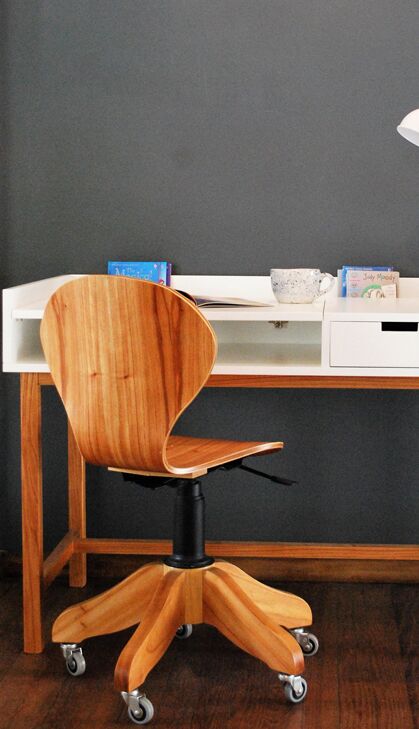 Características técnicas: estructura en madera maciza, tableros en MDF primera calidad. Terminación poliuretánica, lustre o laca semi-mate color. Sistema neumático que permite ajustar la altura de la silla. base maciza con ruedas de goma giratorias.